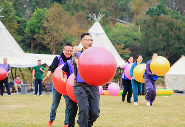 本次运动会精心设置多个趣味竞技项目。在“旱地龙舟”比赛中,队员们骑坐在充气“龙舟”上,步调一致、奋力向前;“同心协力”瑜伽球接力赛则考验着整支队伍的配合与信任,各队小心翼翼、循环接力,全力护送瑜伽球平稳抵达终点;在“承上启下”竞速赛中,队员们展现出卓越的战术布局与团队协作,既要守护己方“充气毯”不落地,又要高效传递“滚动轴”快速前进。现场气氛热烈,加油声、欢呼声此起彼伏。